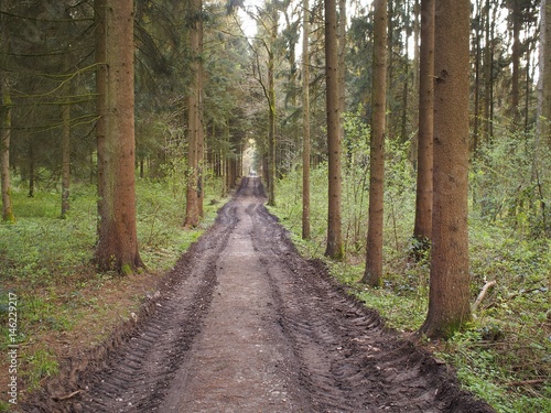 © Glaser, Fototapeta premium Befahrene Forststraße mit Reifenabdrücken