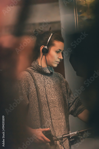© guruXOX, Naklejka premium Behind the scene. Female cameraman shooting film scene with camera