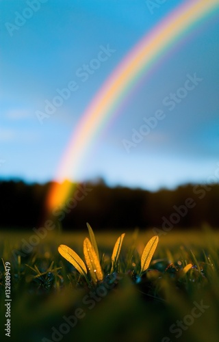 © Saad, Naklejka premium Behold ethereal marvel of a resplendent rainbow gracefully curving above a verdant meadow,