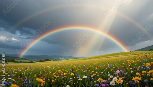 © Rakib, Naklejka premium Behold mesmerizing spectacle of a resplendent rainbow gracefully curving across a plentiful meadow