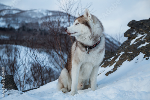 © Anastasiia, Obraz premium Beige and white Siberian husky sitting on the snow on a mountain in the background of mountains and forests.