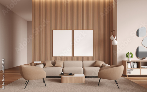 © ImageFlow, Obraz premium Beige and wooden living room with sofa and posters