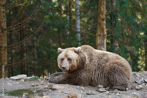 Fototapeta premium Beige bear in forest, space for text. Wild animal