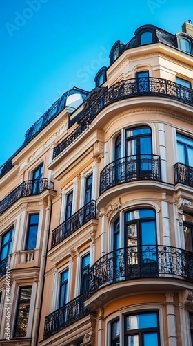 © Abdul, Fototapeta premium Beige building facade, ornate balconies, clear blue sky