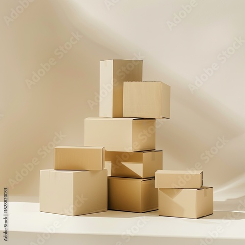 Obraz premium Beige Cardboard Boxes Stacked, Sunlight, Minimalist Studio, Packaging