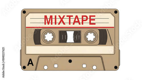 Fototapeta premium Beige cassette tape labeled mixtape with red text and black reels isolated on...