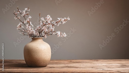 Fototapeta premium Beige ceramic vase with delicate white cherry blossoms on a wooden table against a plain neutral backdrop. Concept Minimalist Still Life, Beige Ceramic Vase, White Cherry Blossoms, Wooden Table