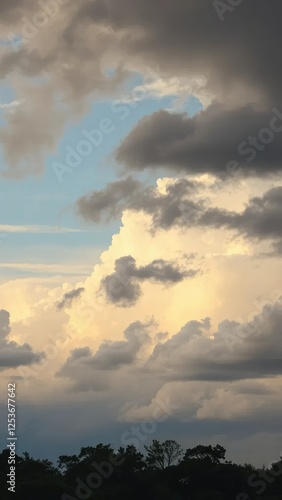 © Sourithideth, Fototapeta premium Beige cloudy sky with dark brown stormy clouds and black trees on the horizon, dark, summer