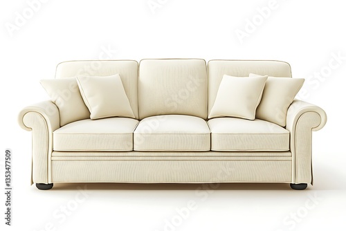 © Asrianto, Fototapeta premium Beige couch with pillows on white backdrop, perfect for furniture store product