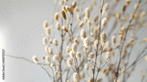 © Generative AI, Fototapeta premium Beige dry flowers fluffy like pussy willow branches with selective focus against a white wall : Generative AI