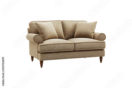 © Miltan, Fototapeta premium Beige Fabric Loveseat Isolated on White and Transparent Background PNG Image.