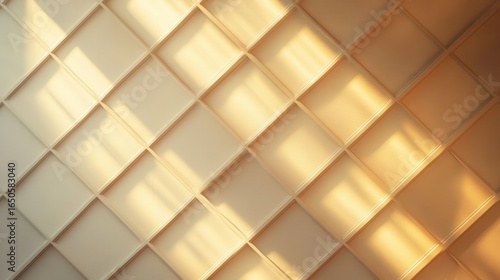 © Keempat, Fototapeta premium Beige grid pattern wall with diagonal sunlight