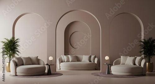 Fototapeta premium Beige, Living room, Modern, Modern Beige Living Room with Archways and Round Furniture