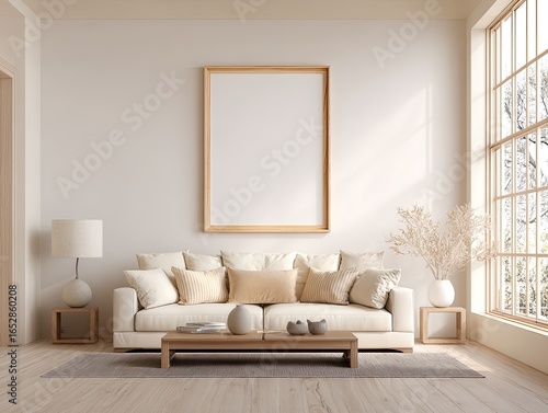 © Breken, Fototapeta premium Beige minimalist living room with large framed art