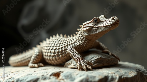 © Mukib, Naklejka premium Beige reptile figurine on rock.