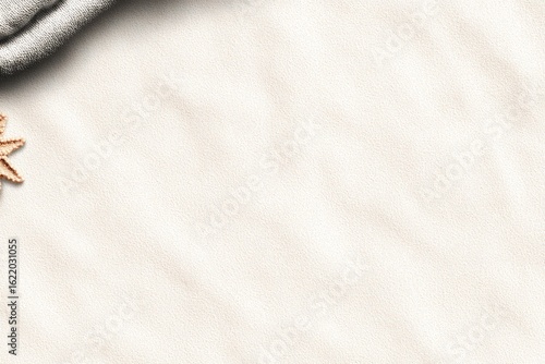 © abdul, Naklejka premium Beige sand surface with a light gray cloth draped over a corner and a light brown starfish