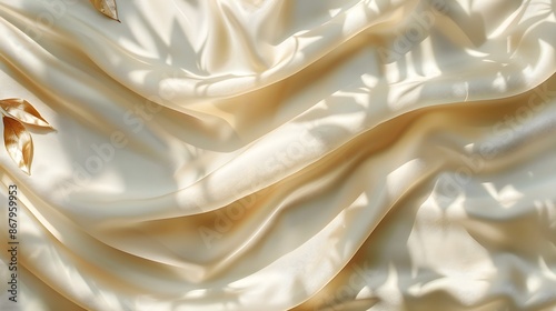 © Spectrum, Obraz premium Beige satin fabric texture background with shadow of leaves. Top view flat lay