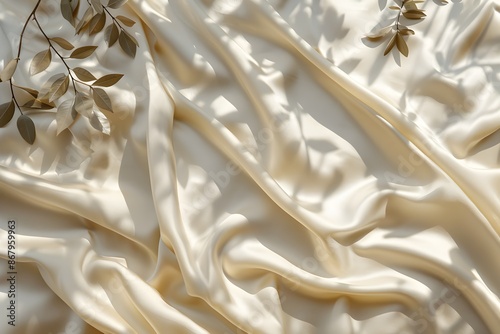 © Spectrum, Obraz premium Beige satin fabric texture background with shadow of leaves. Top view flat lay
