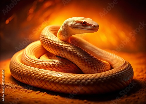© Arnada, Fototapeta premium Beige Snake Curled on Vibrant Orange Background - Night Photography