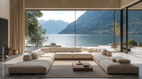 © Talha, Fototapeta premium Beige sofa in spacious room with terrace and panoramic windows offering stunning lake or sea view
