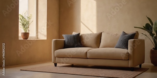 Fototapeta premium Beige sofa next to a stucco wall, facing a grid window. Modern living room...
