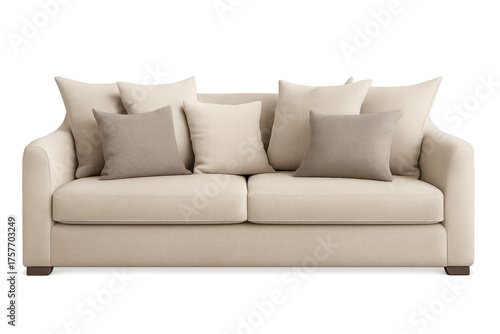 Fototapeta premium Beige sofa with accent cushions on transparent background