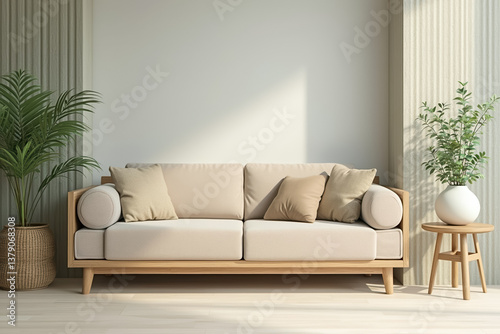 Fototapeta premium beige sofa with cushions in a minimalist living room setting