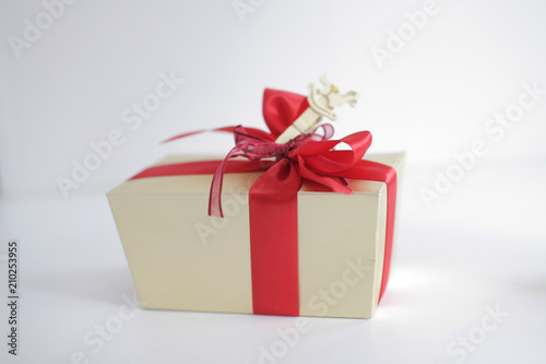 © aaalll3110, Obraz premium Beige square gift box with red bow on white background