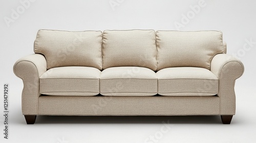 Fototapeta premium Beige Upholstered Sofa with Three Cushions on Neutral Background