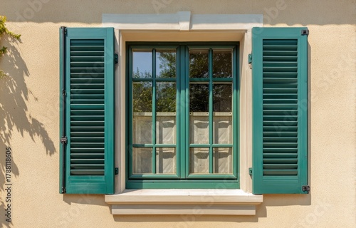 © Kartunlucu, Fototapeta premium Beige wall with teal shutters and window
