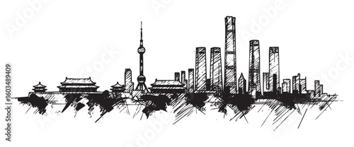 © tarakacraft, Fototapeta premium beijing china cityscape tall building engraving sketch vector illustration