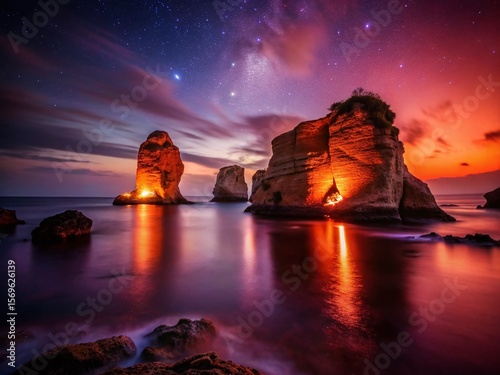© Supittra, Obraz premium Beirut Pigeon Rock Night Photography: Stunning Coastal View of Raouche Rocks at Night