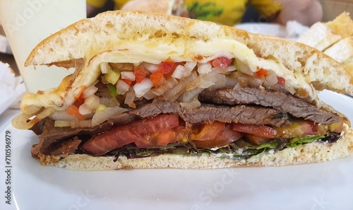 © Elis Cora, Fototapeta premium Beirut sandwich (Beirut is a Brazilian sandwich), on a plate in a restaurant, front view. The sandwich was invented in 1950 by two Lebanese brothers, owners of a coffee shop in São Paulo, Brazil.