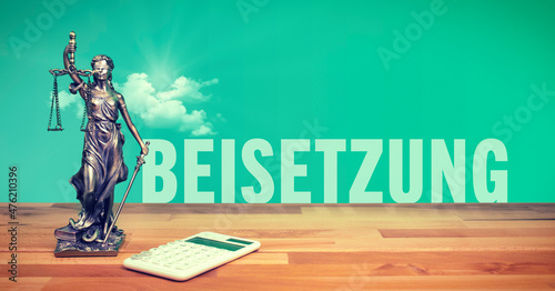 Obraz premium Beisetzung. Justita als Symbol für Anwalt, Recht und Gesetz. Text in deutsch.