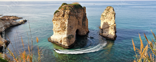© diak, Fototapeta premium Bejrut, Liban: łódź motorowa zabiera turystów po słynnych skałach gołębi.