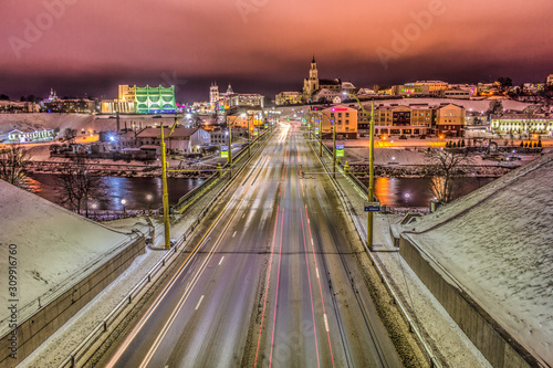 © Irida, Fototapeta premium BELARUS, Grodno, January 3, 2019: Night Grodno, road with cars, bridge with cars at night.