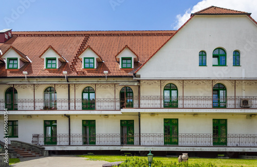 © Sviatlana, Fototapeta premium Belarus, Minsk - June 6, 2022. Two-story beautiful long house