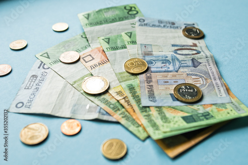 Fototapeta premium Belarusian rubles and coins on a colored background