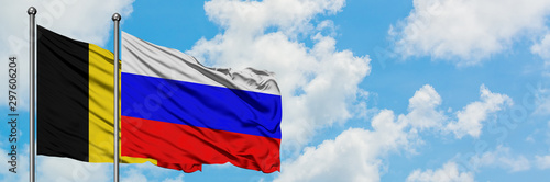 © sezerozger, Naklejka premium Belgium and Russia flag waving in the wind against white cloudy blue sky together. Diplomacy concept, international relations.