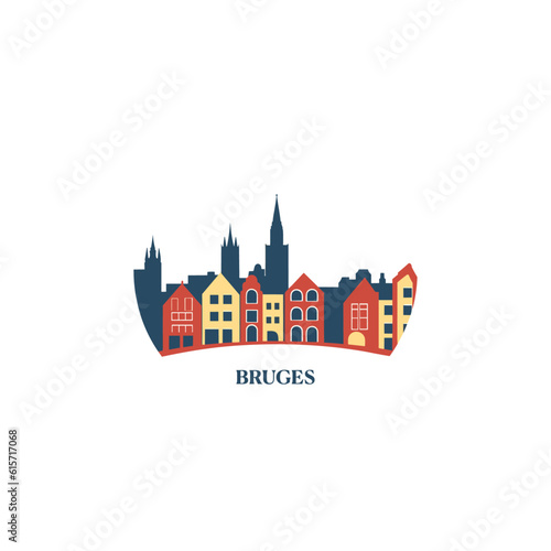 Obraz premium Belgium Bruges cool cityscape with skyline landmarks vector isolated logo. Panorama flat abstract shape West Flanders region colorful icon