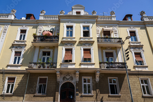 © krugli, Naklejka premium Belgrade, Serbia - April 19, 2018. Living architecture building facade in old town central street close view with details. Apartment building with brown shutters in Belgrade's historical center.
