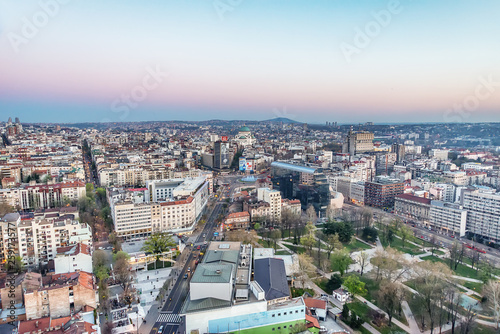 Obraz premium Belgrade, Serbia March 31, 2019: Panorama of Belgrade. The photo shows the Slavija Square, the Belgrade municipality of Vracar, the temple of St. Sava and the narrow center of the city.