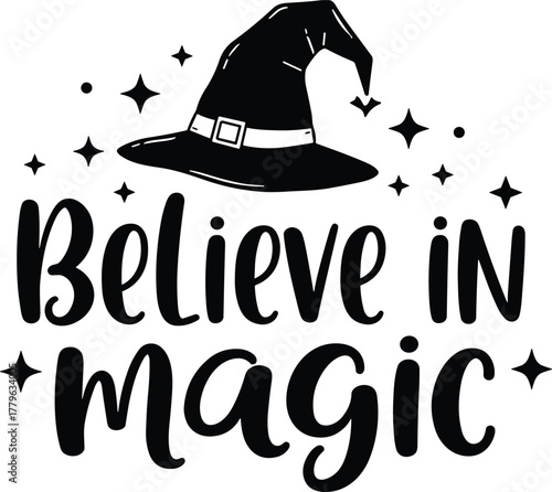Naklejka premium Believe in magic typography design with witch hat, inspirational Halloween quote, mystical stars illustration, black and white magical artwork