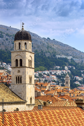 © afm_photo, Fototapeta premium Bell tower and red-orange roof on a background of mountains and