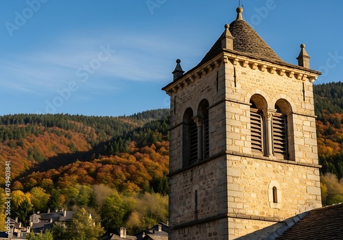 © Mul, Fototapeta premium Bell Tower in France with Autumn Foliage Backdrop.