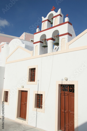 © lisastrachan, Fototapeta premium Bell tower of a traditional whitewashed church, Oia, Santorini, Greece.
