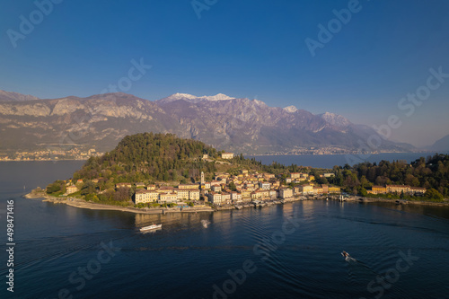 © SirDiegoSama, Fototapeta premium Bellagio city son Lake Como seen from the lake, aerial shot.