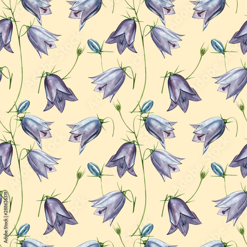 Obraz premium Bellflower blossoms, leaves and bouquets set. Seamless patterns. Watercolor...