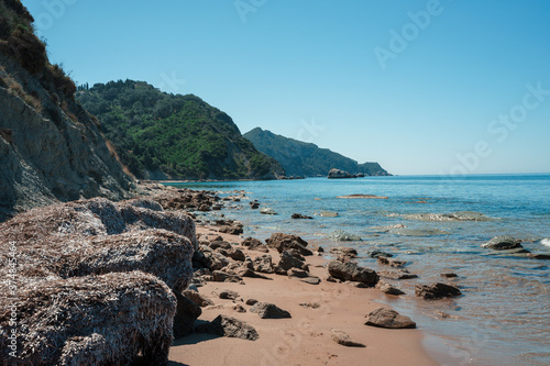 Obraz premium Bellissimo paesaggio marino con veduta della costa e scogli. Corfù, Grecia