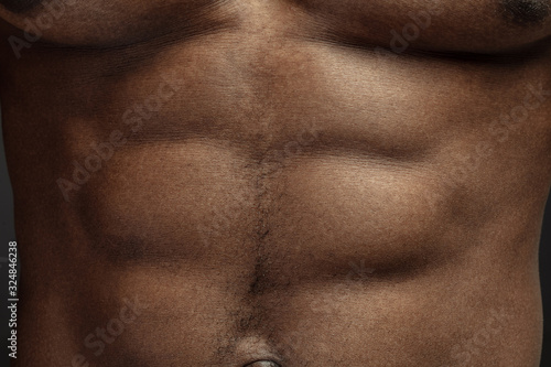 Fototapeta premium Belly. Detailed texture of human skin. Close up shot of young african-american male body. Skincare, bodycare, healthcare, hygiene and medicine concept. Looks beauty and well-kept. Dermatology.